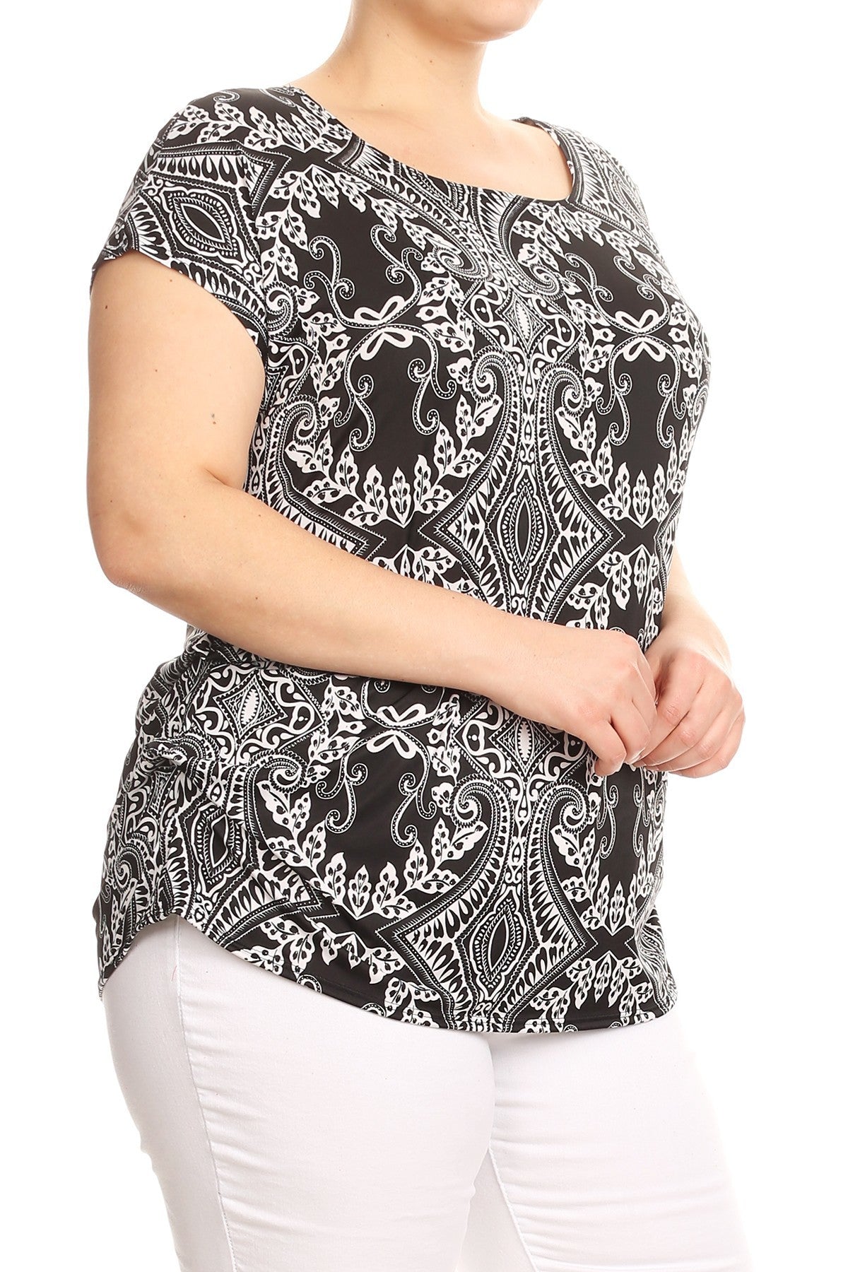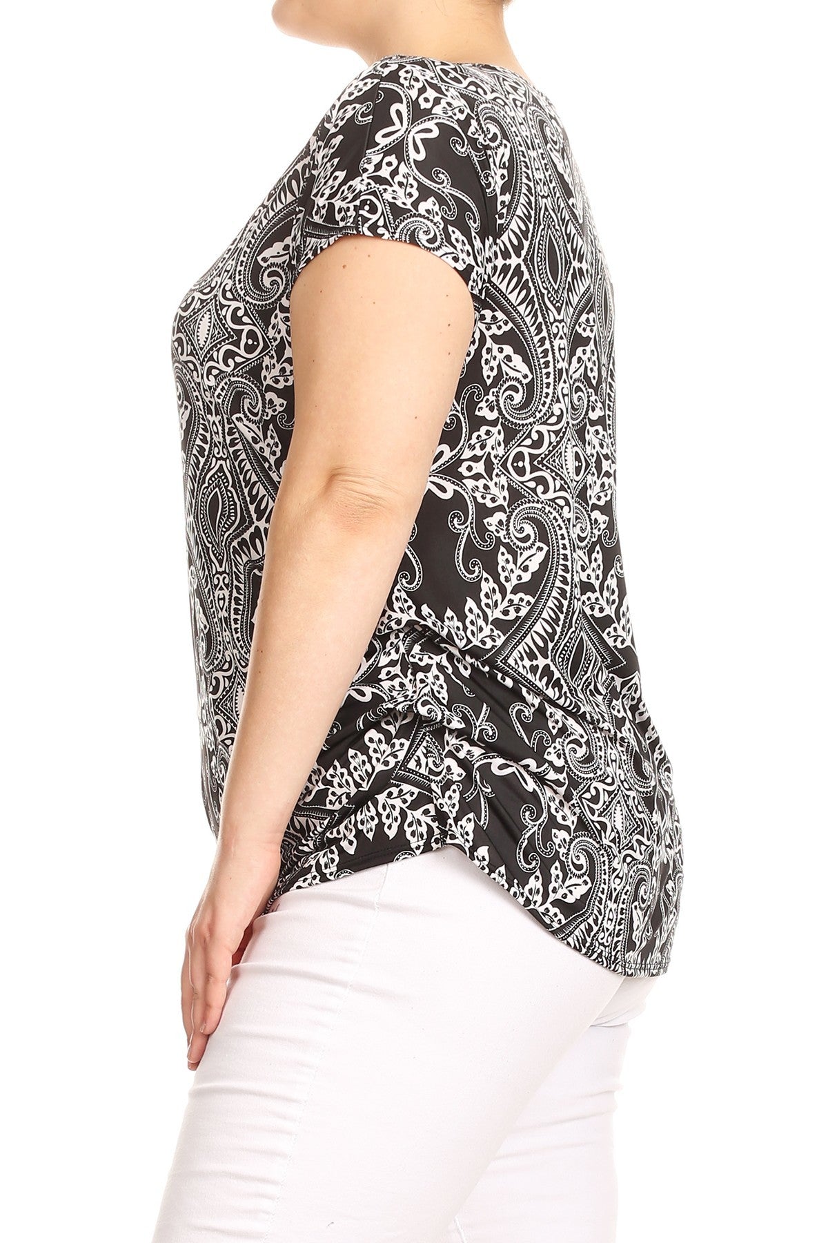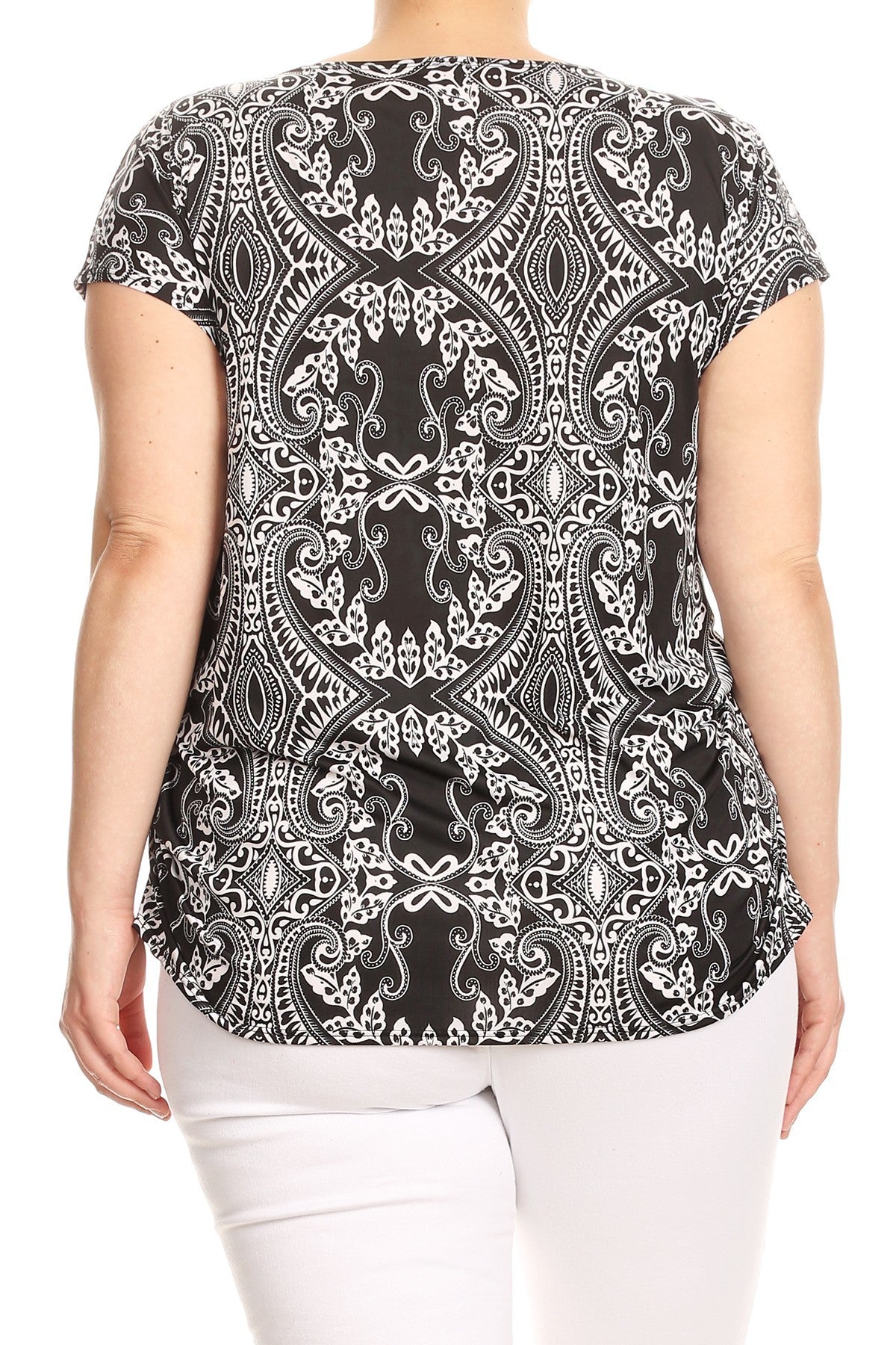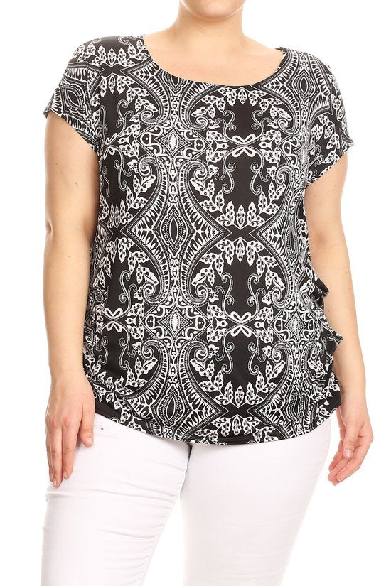 Black and White Printed Short Sleeve Curvy Top with Side Ruched Detail