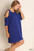Cobalt Blue Cold Shoulder Dress With Ruffles. Available in Plus Sizes