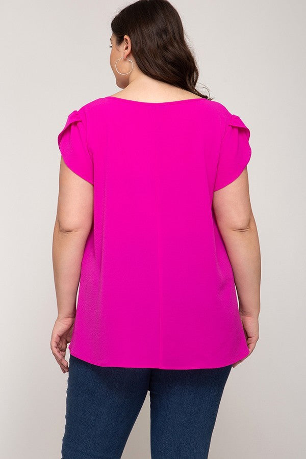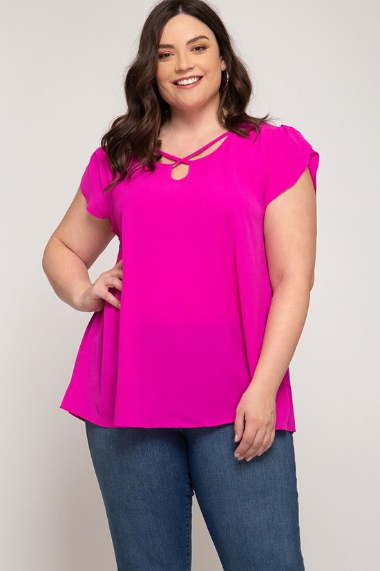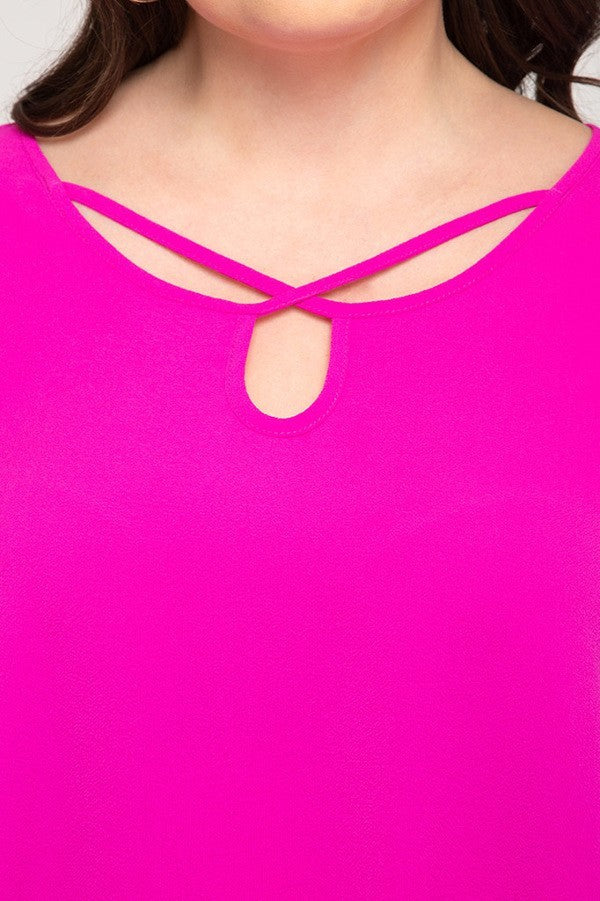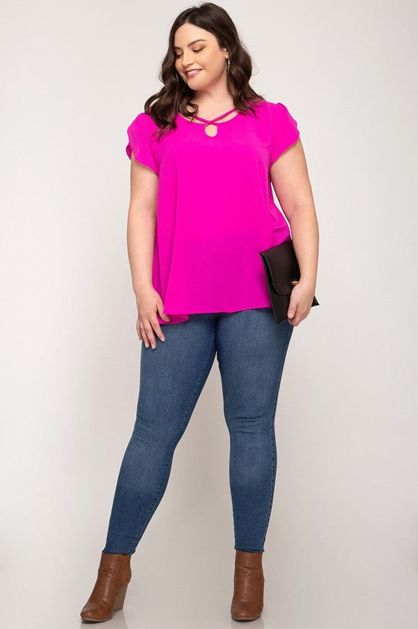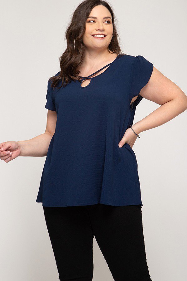 Navy Tulip Shaped Cap Sleeve Woven Curvy Top with Crisscross Front Detail