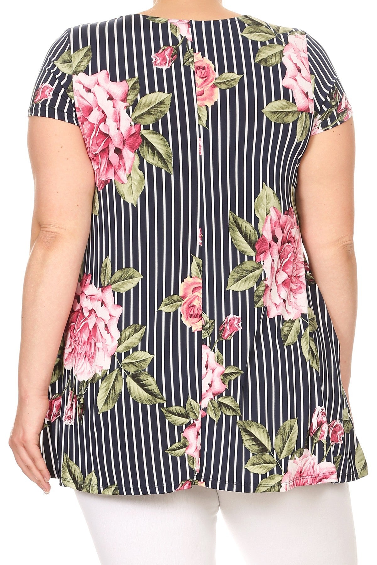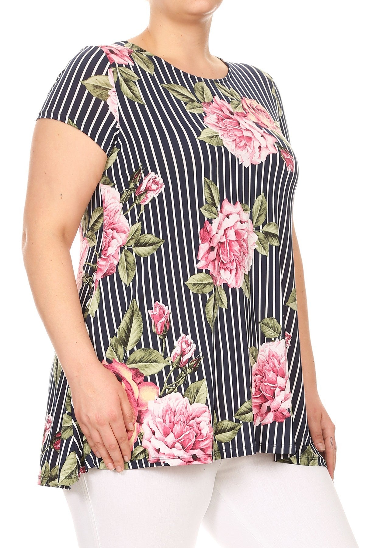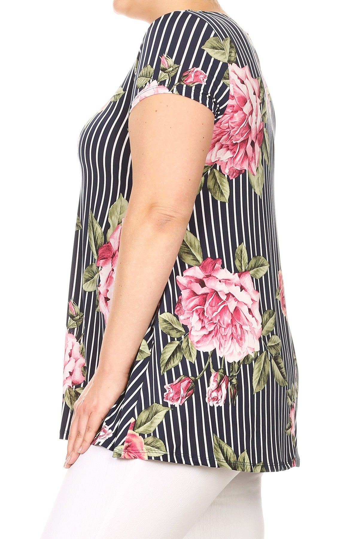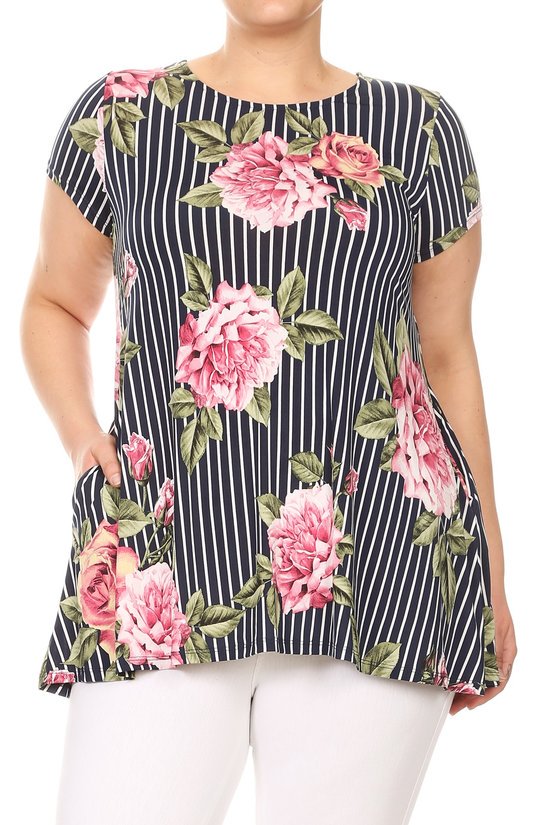Stripes and floral print relaxed fit short sleeve top with pockets. Available in Plus Sizes 1XL-2XL-3XL. Featured in our Curvy Styles Collection.