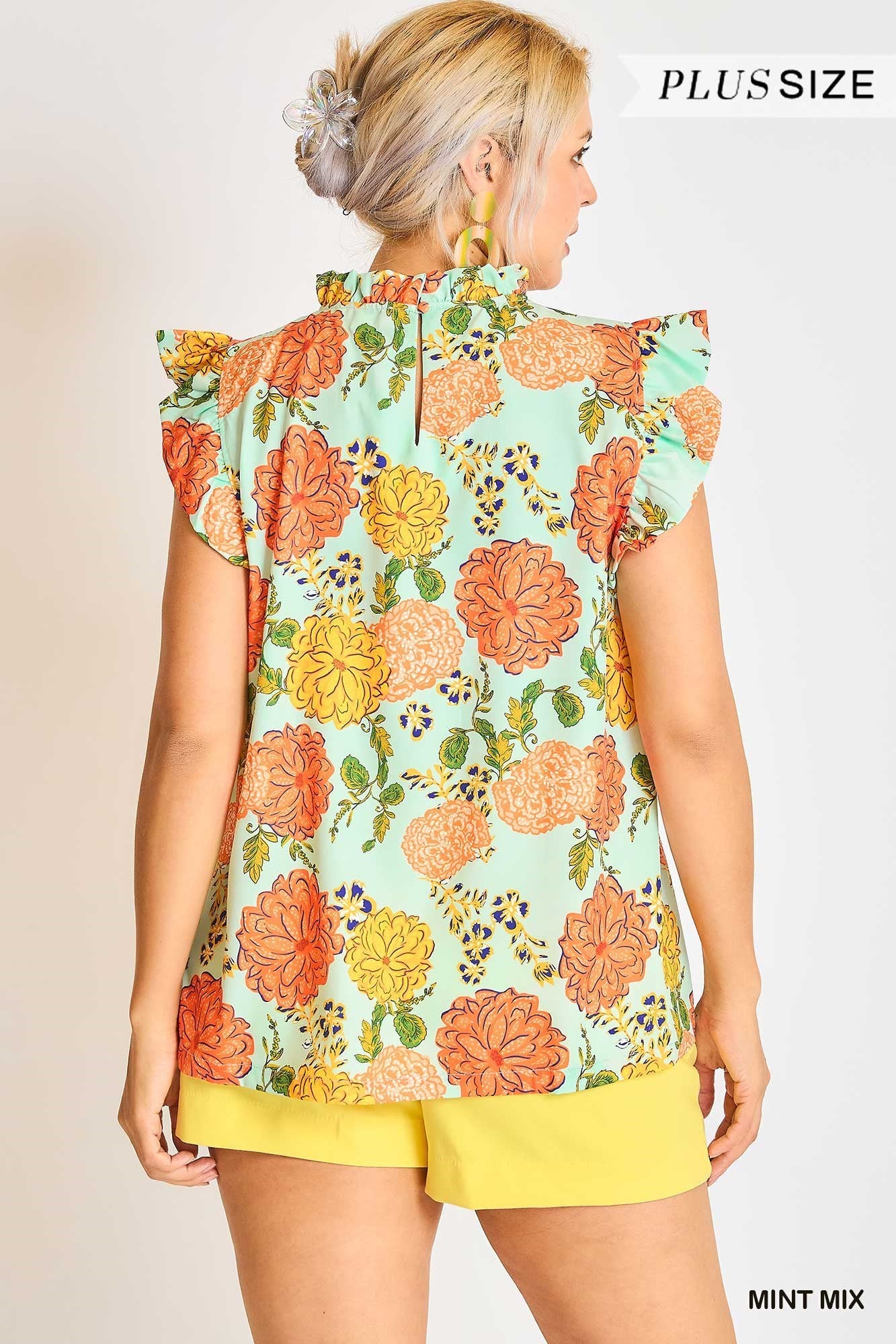 Mint Floral Print High Ruffle Neck Boxy Cut Top with Ruffle Sleeve Curvy