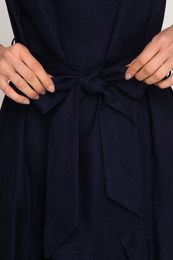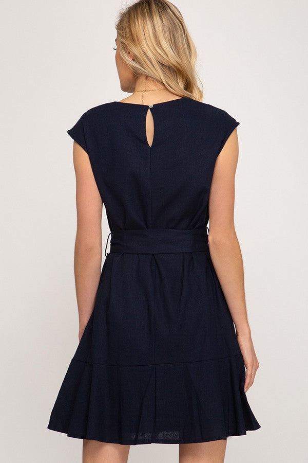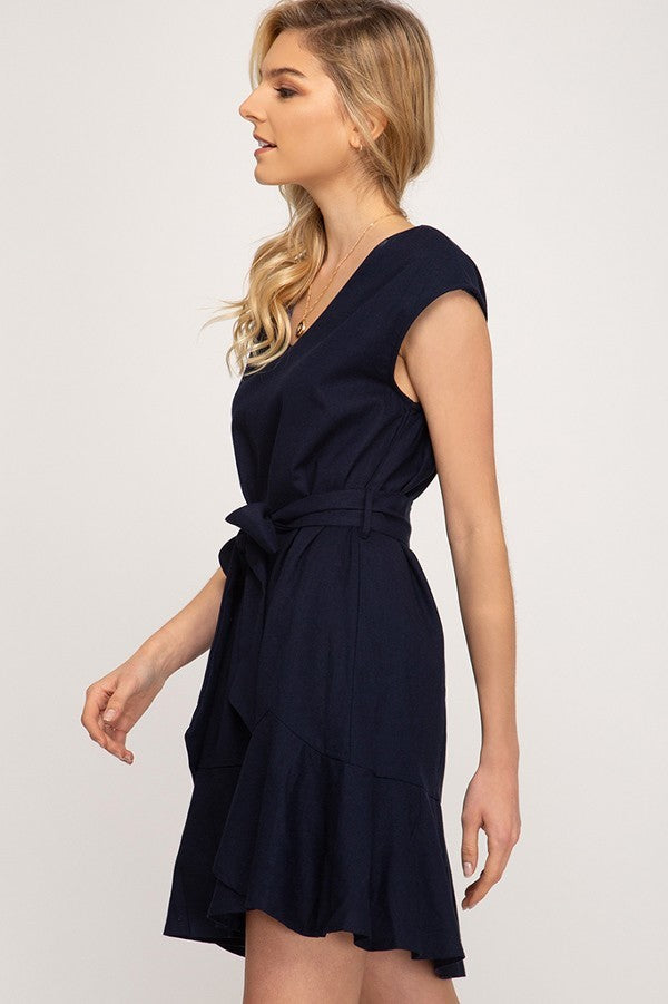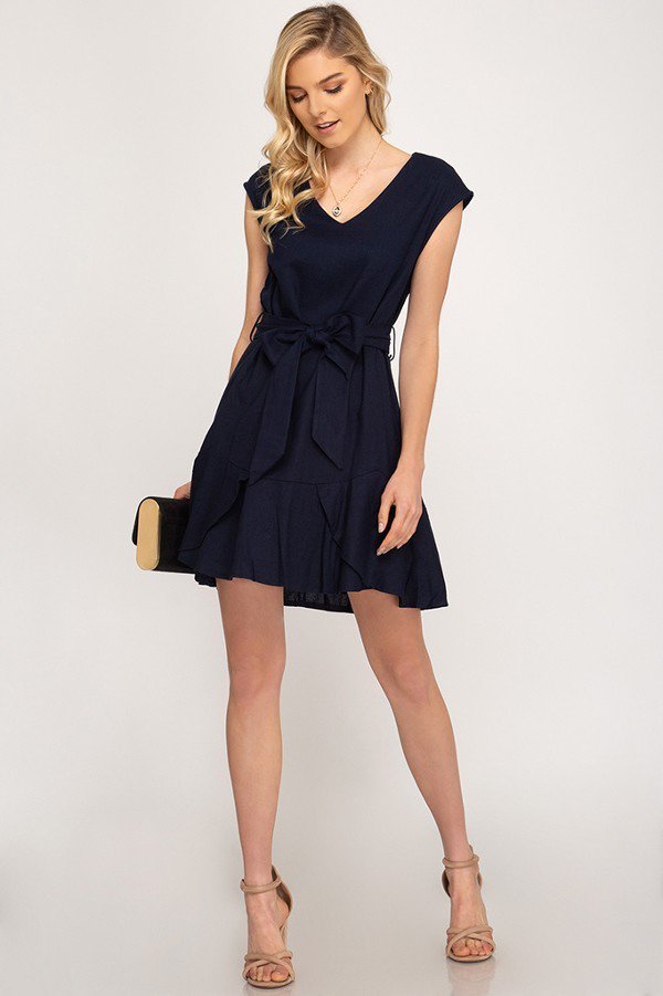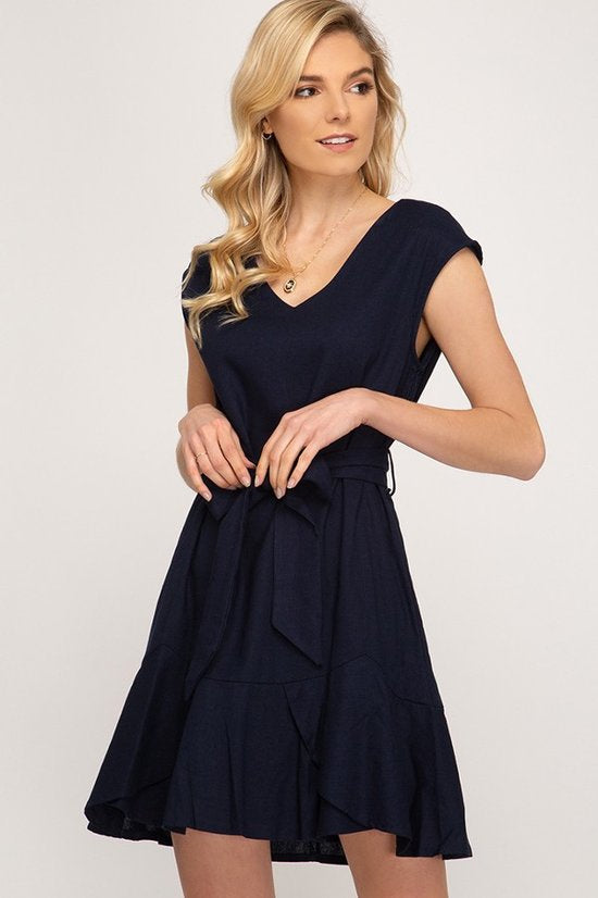 Navy Drop Shoulder V-Neck Woven Dress with Flounce Hem and Waist Sash