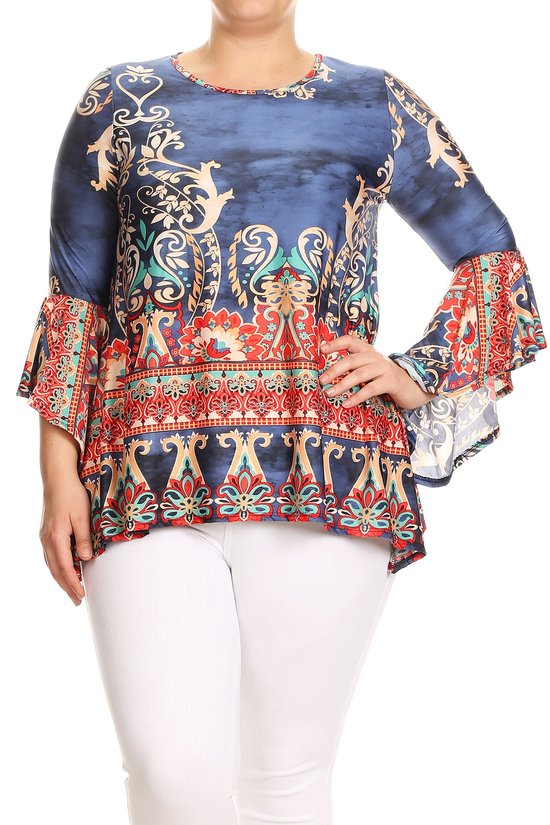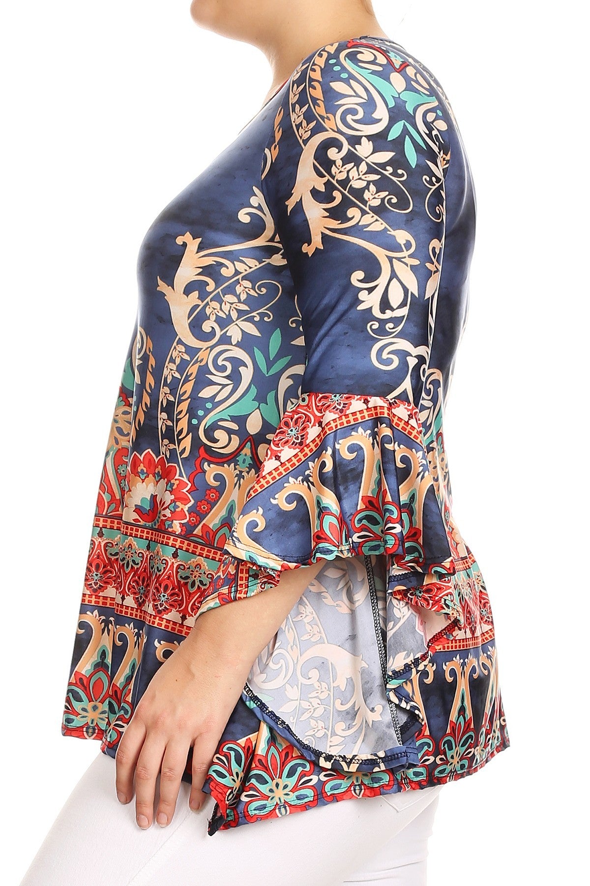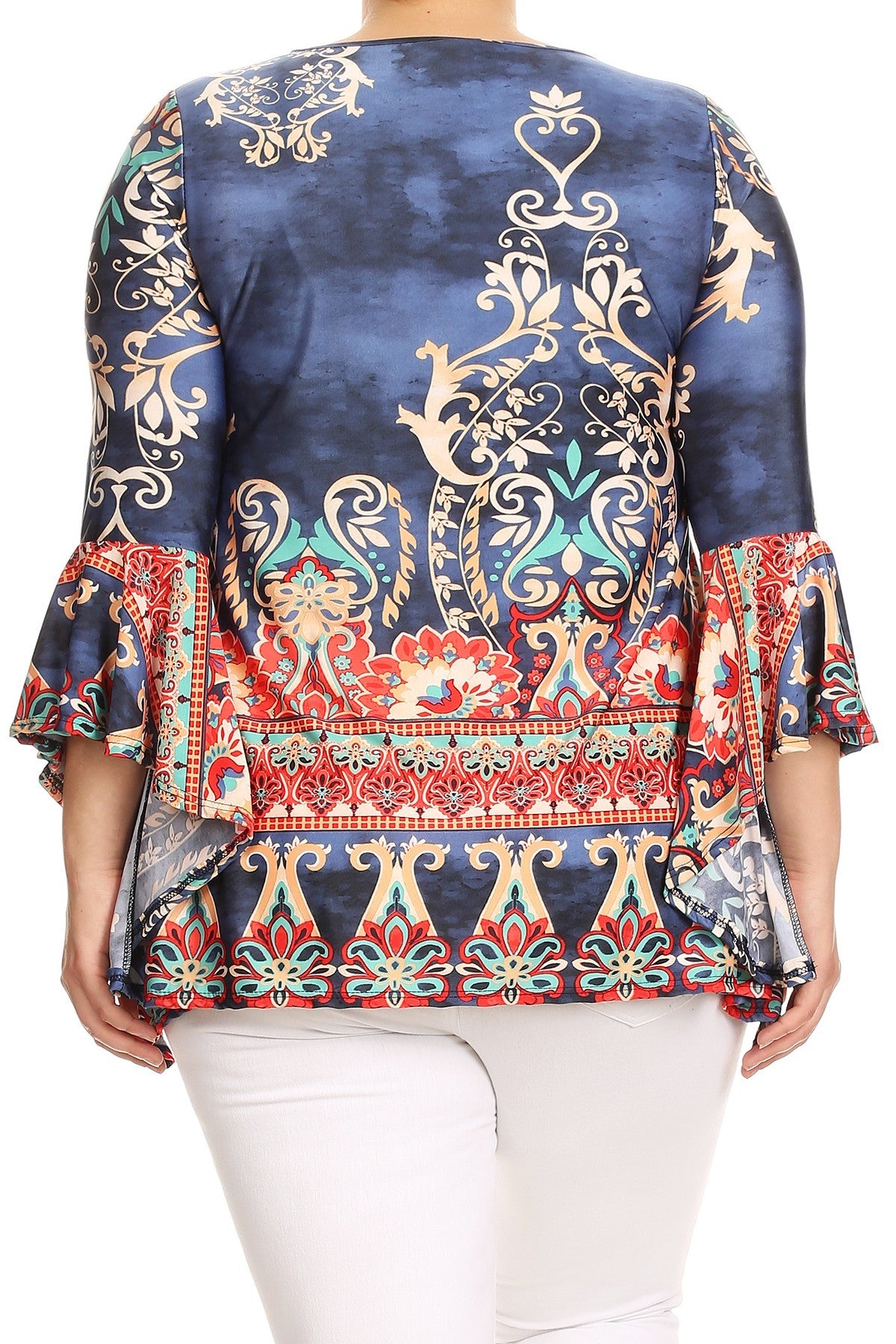 Abstract Print Curvy Top with 3/4 Flutter Sleeves