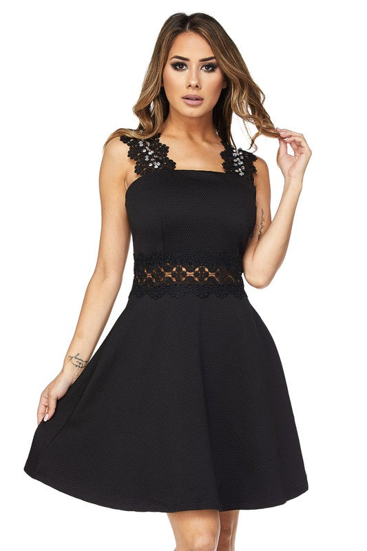 Flirty Short Black Dress, Lace Sleeves and Waist with Pockets.