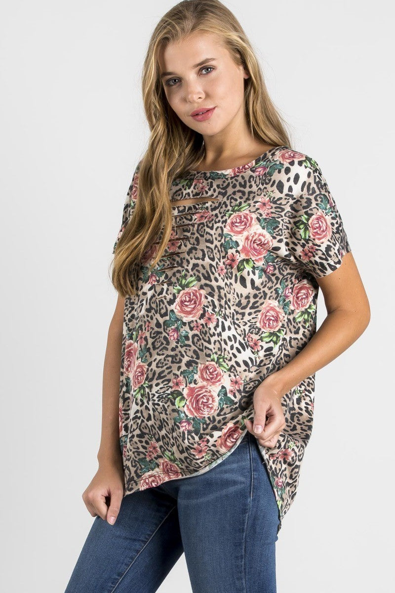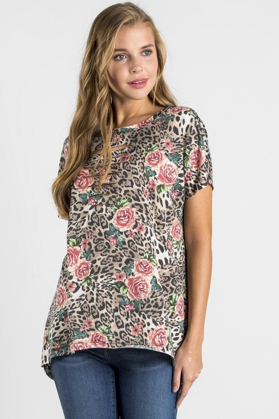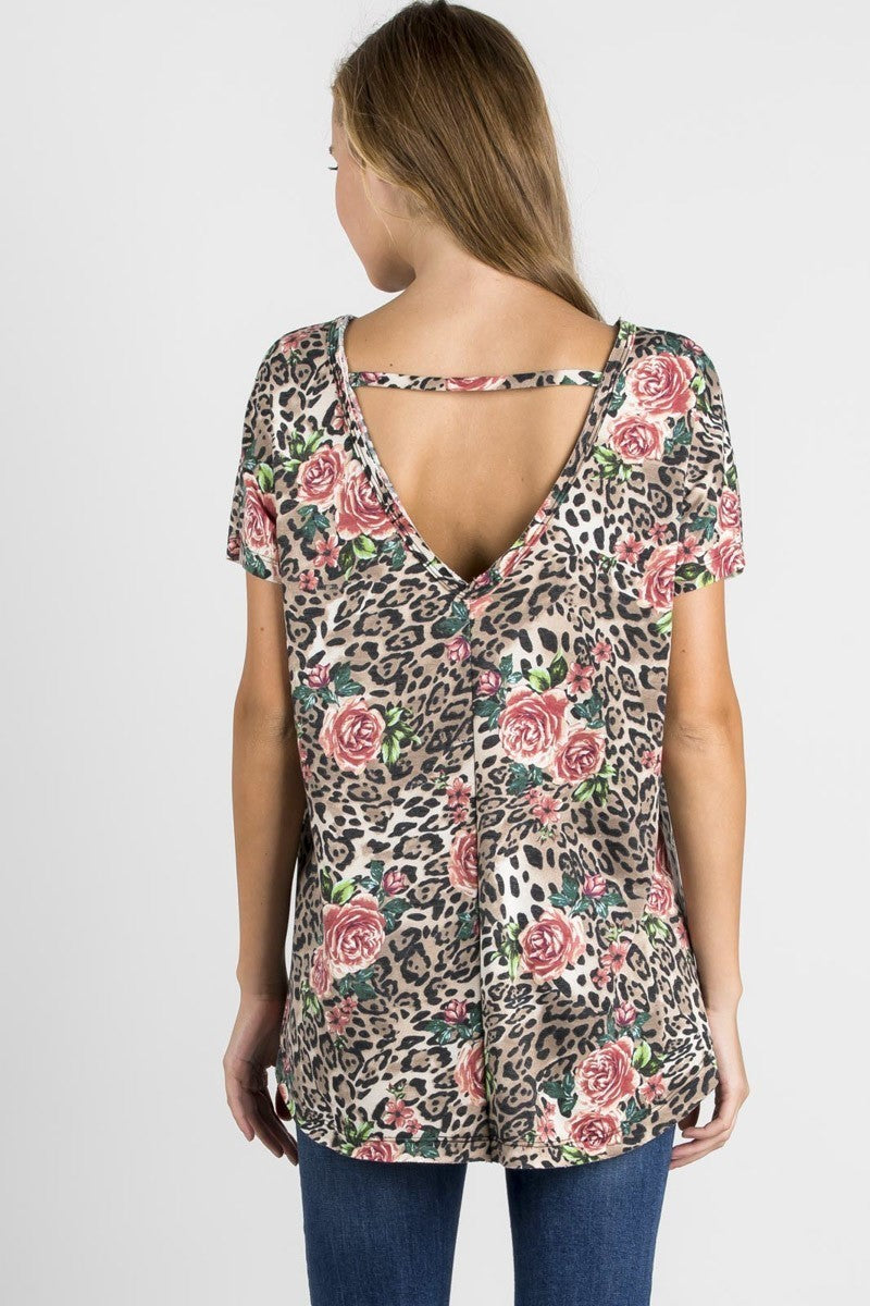 Leopard Print Cut-Out Neck Open Back Short Sleeve Top