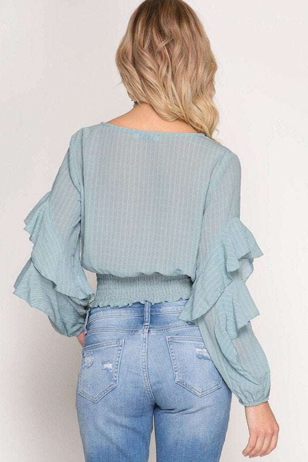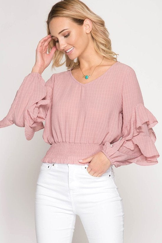 Rose Pink Long Sleeve Textured Top with Waist Elastic Smocking and Ruffle Sleeves