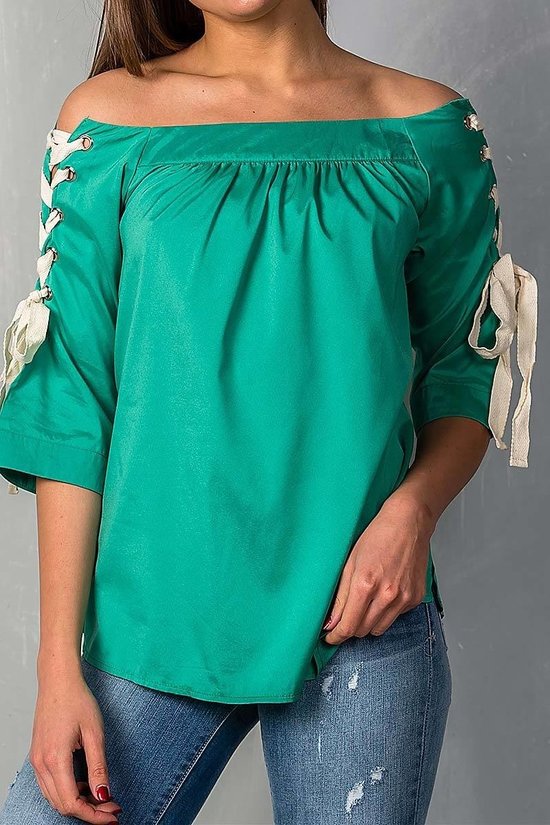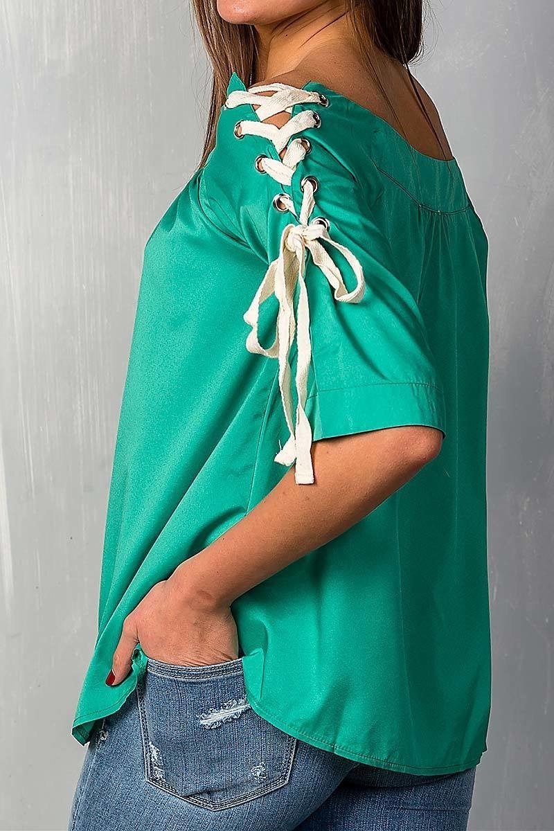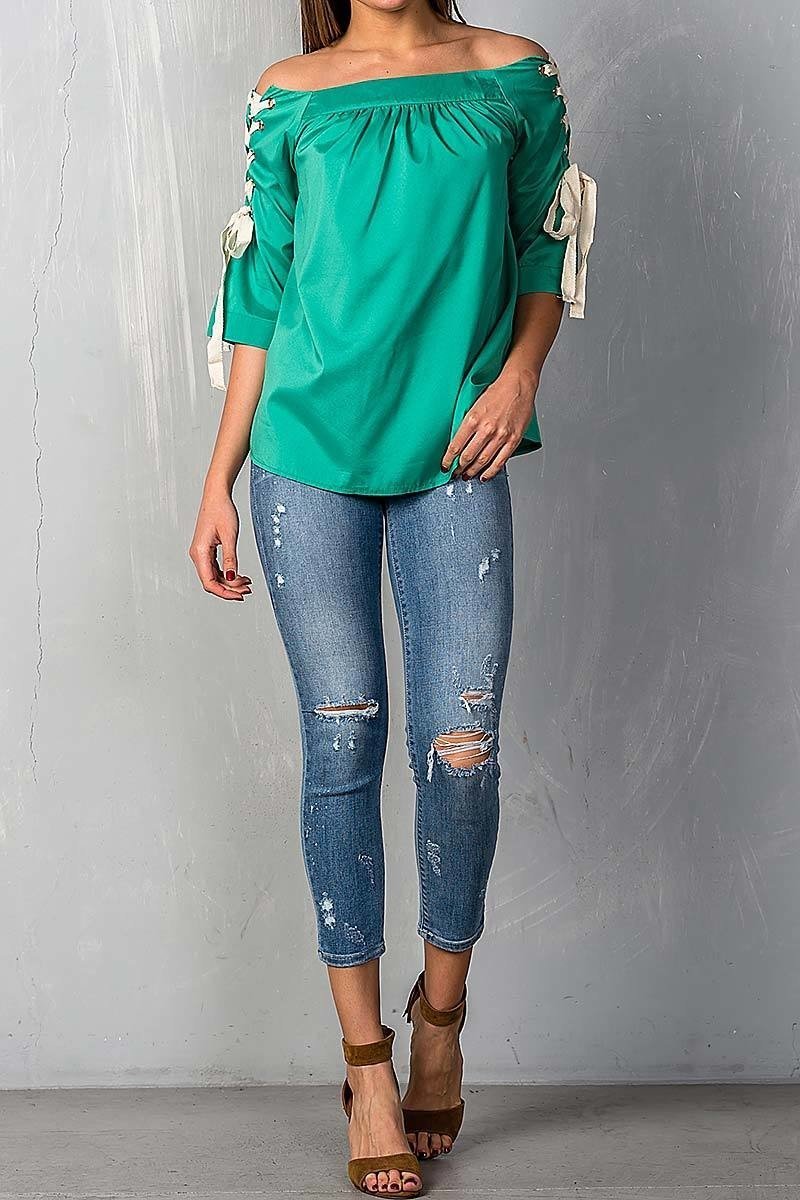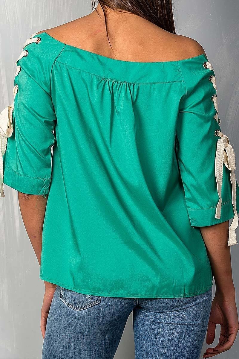 Green Off Shoulder Top with Lace Up Detail Sleeves