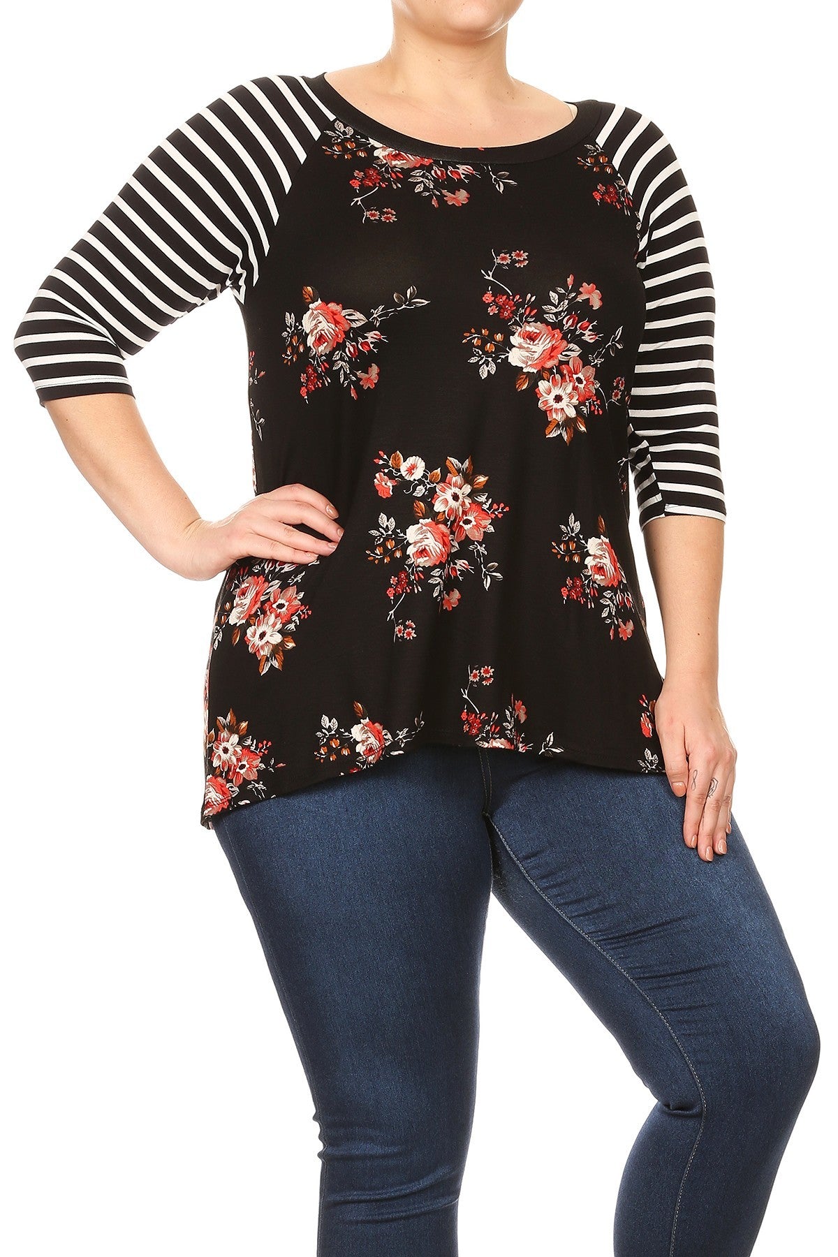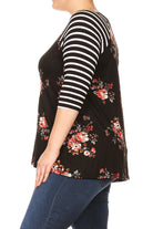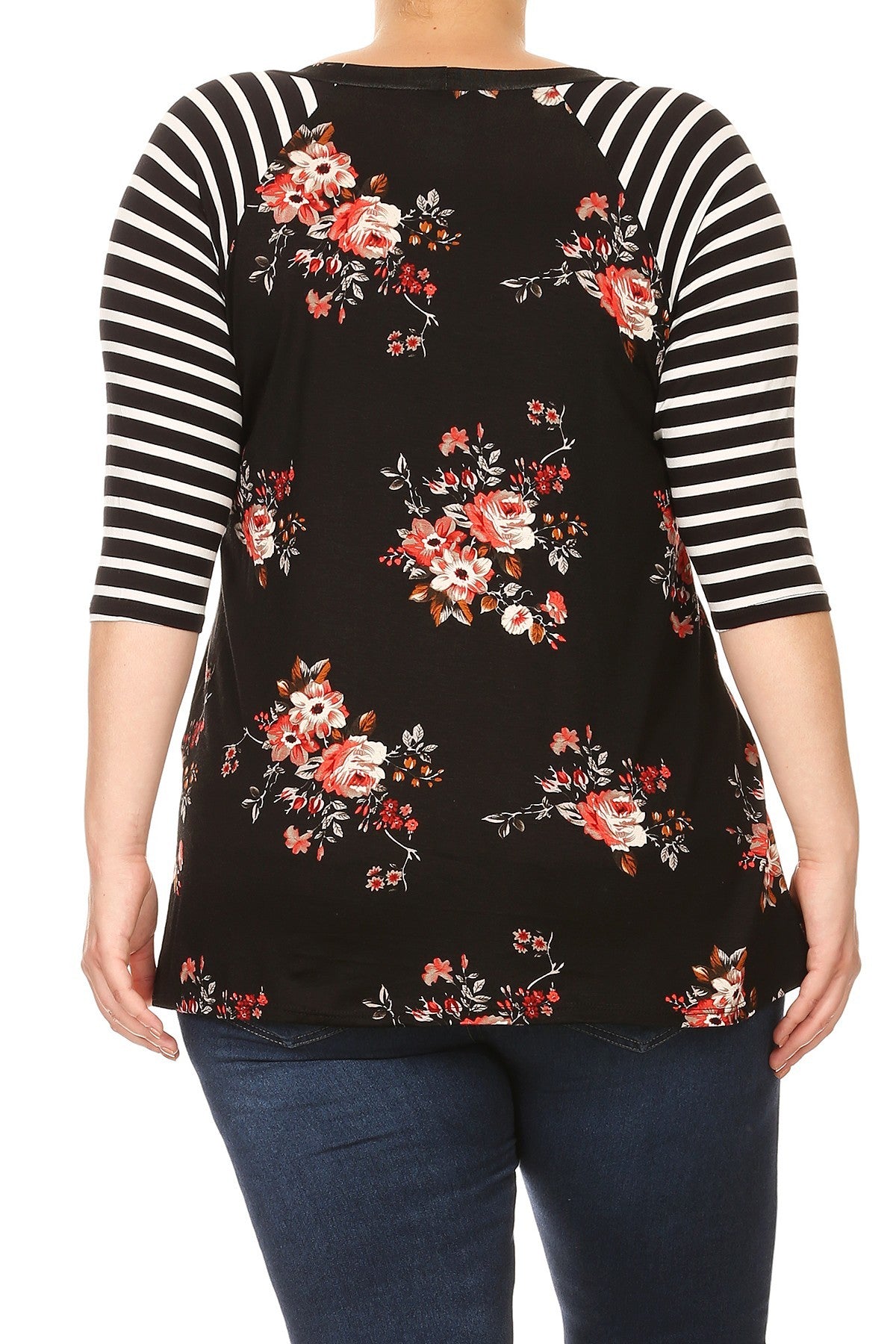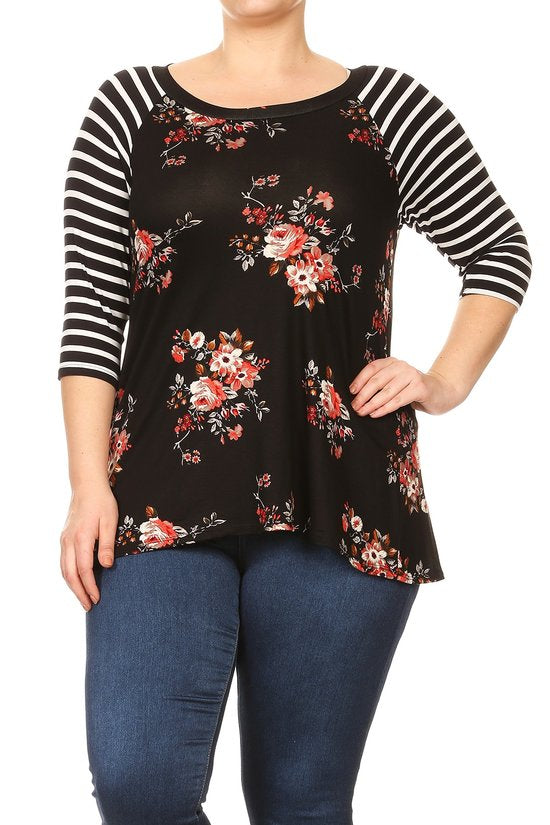 Black Floral Tunic Top With Striped 3/4 Sleeves Curvy
