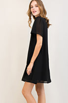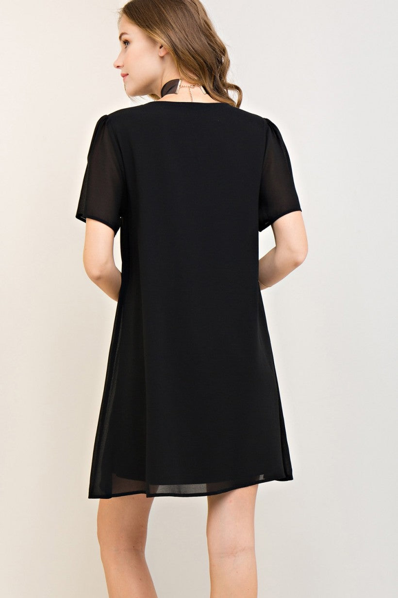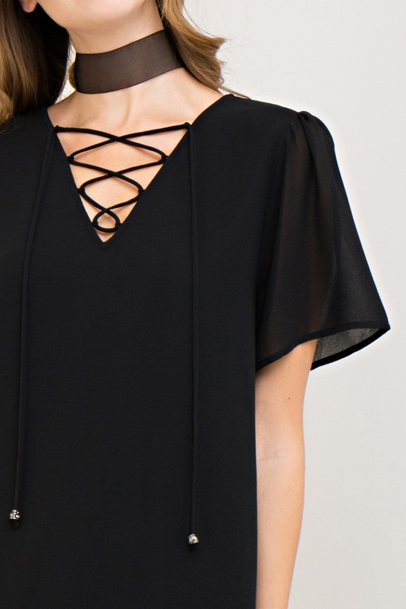 Black Beauty Short Sleeved Dress With Crisscross Tie Closure At Bust