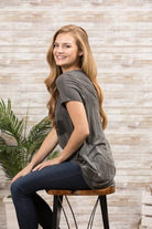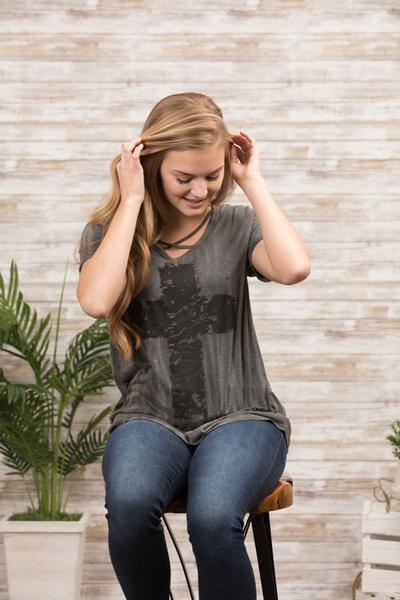 Charcoal and Black "Distressed cross" short sleeve Criss Cross neck washed jersey tee.