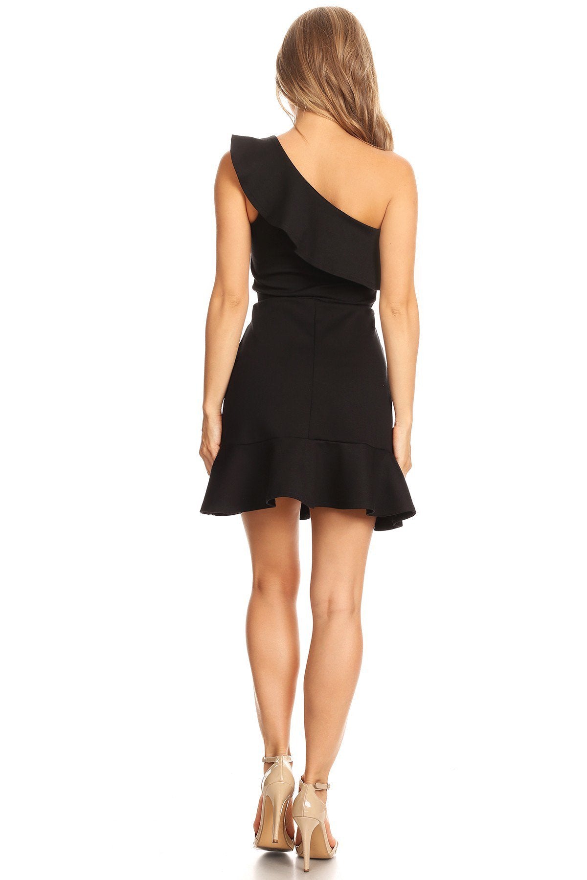 One shoulder A-line dress with ruffle detail at neckline and hem.